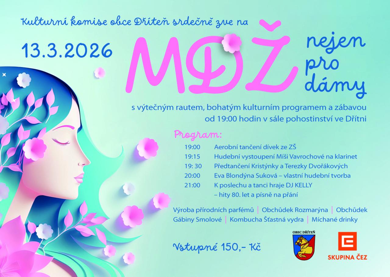 Kulturní komise obce Dříteň srdečně zve na oslavu Mezinárodního dne žen, který se koná 13. března 2026. Akce začíná v 19:00 hodin v sále pohostinství ve Dřítni. Můžete se těšit na pestrý kulturní program, který zahrnuje aerobní tančení dívek ze ZŠ, hudební vystoupení Míši Vavrochové a předtančení Kristýnky a Terezky Dvořákových. O zábavu se postará DJ KELLY, který hraje hity 80. let a písně na přání, a také Eva Blondýna Suková se svou vlastní hudební tvorbou. Součástí akce je také výtečný raut.